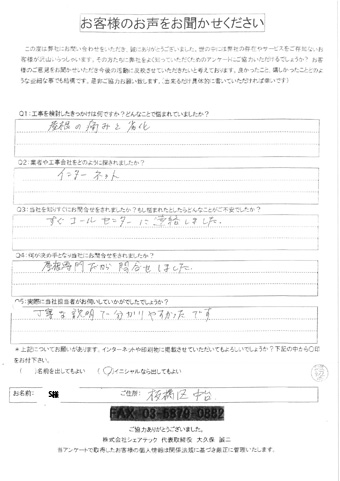 初めての屋根修理なので心配でしたが、担当者の田中さんのていねいな対応が良かった 説明を色々と親切にしてもらいました