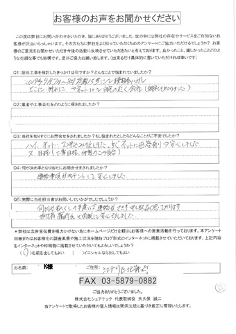 調査報告を行いK様とメンテナンス方法をご相談したところ、今回も塗装でのメンテナンスをご希望でしたので、屋根塗装工事のご提案を行い、ご検討の末工事をお任せいただく運びとなりました!