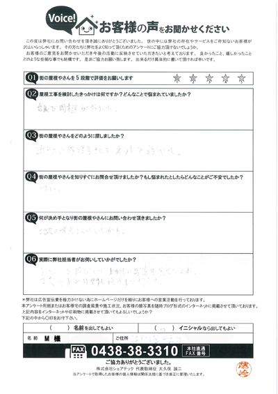 工事をお願いする予定でしたが、工事後の保証に関しての説明が無く不安を覚えた為、私達「街の屋根やさん」へお問い合わせをいただき、調査に伺いました。