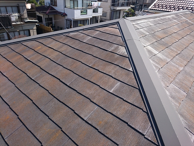 スレート葺きの屋根は、表面が劣化していてコケの付着が全体的に出ていました。劣化すると表面の撥水性が落ちてしまうので、雨が降ると雨水を吸い込んでしまい、北面が特にこの状態になりやすくなります。