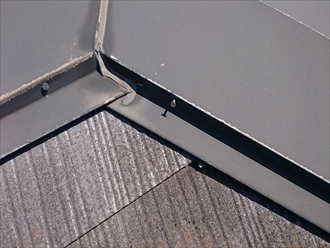 一か所割れて知る部分がありました。割れてスレートがズレた跡がくっきりと残っており、大分前からこの状態だったことが分かります。棟板金の下地の木は傷んでいませんが、釘で固定しているので、徐々に緩んで浮いたところがあります。浮いた釘を打ち込んでみるとしっかりと効いていましたので、直ぐに浮いたり剥がれたりする心配は無さそうです。屋根全体をみてみましたが、下地に問題はありませんので直ぐに直さないと駄目な部分はありませんでしたが、防水紙の寿命を考えると、メンテナンスは塗装工事ではなくカバー工事が適切だとおもいます。横浜市中区の建物は、スレートの傷みと年数を考えてカバー工事のご提案を致しました。