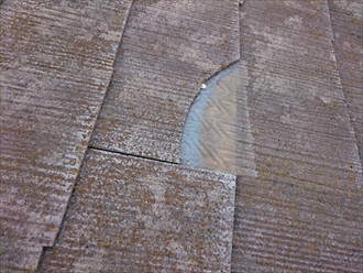 コケやカビの付着と合わせて、劣化すると反りが出てきます。スレートは約6mm程度の薄い屋根材なので、反りが出てしまうと割れる原因にもなってしまいます。反った所に台風などの強風が吹き込んで完全に割れてしまう事もあります。