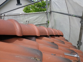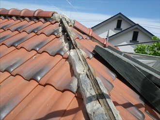 棟瓦を一旦取り外し、下地の状態を確認します。芯木が傷んでいて漆喰もぼろぼろの状態です。これを綺麗に撤去していきます。