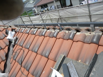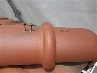 最後に取り外した棟瓦を戻して完成です。元々は釘でしたが、新しくパッキン付きのビスで固定していきます。