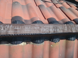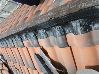 樹脂製の芯木の上に『ハイロール』と言う防水シートを張っていきます。ブチルの粘着で瓦にフィットします。両サイドがジャバラ状になっているので、瓦のR部分にもピッタリ貼れます。