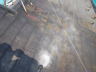 左写真は高圧洗浄の様子です。手前が洗浄を行った箇所で、奥手は未実施のところです。手前は洗浄によって苔が取り除かれているのがお分かりいただけるでしょうか? 15Mpaの高圧で水を噴射しているので、苔や汚れはもちろんのこと、古くなって浮いた塗膜も取り除くことができます。右写真が洗浄後です。苔や汚れを洗い流したことで、屋根の表面が白っぽくなっています。