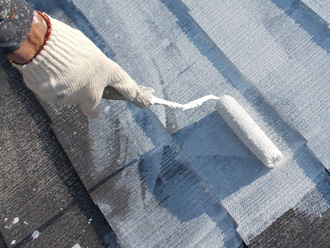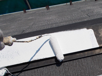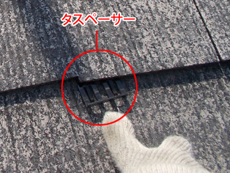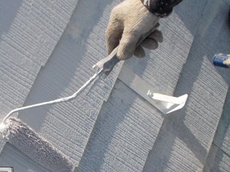 高圧洗浄後、タスペーサーを使って縁切りを行います。縁切りとは屋根材の重なり部分に適度な隙間を作る作業のことです。これを行わないと、塗装によって屋根材の重なり部分に隙間がなくなります。隙間がないと、毛細管現象によって雨水が内部に浸入し、雨漏りすることがありますので、タスペーサーを差し込んで十分な隙間を作ります。縁切り後、下塗りを行います(右写真)。