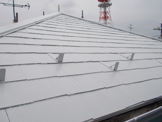 中塗り後、さらに上塗りを行い仕上げます(左写真)。右写真が屋根塗装が完了したとことです。棟板金だけでなく、雪止め金具もしっかり塗装してあります。