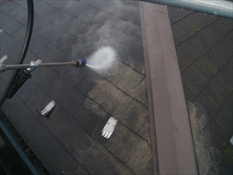 築12年で初めてのメンテナンスで、屋根と外壁の塗装工事を行います。スレート葺きの屋根で、割れたり反ったりしていなく比較的良い状態でした。塗膜の劣化は無いのですが、コケが結構生えておりました。