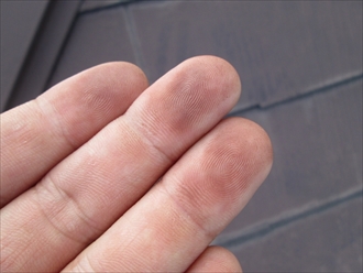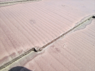 屋根はスレート葺きです。4年前に塗装工事をしたそうなのですが、スレートの重なり部分に既に雨染みが出来ています。塗装の後に縁切りをしていないので、塗膜で覆われた部分と切れている部分があり、溜まった雨水が切れ目からじわじわと染み出すので、この様に雨染みになってしまいます。