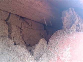漆喰がなくなると雨が降るたびにどんどん下地の泥が流れ出ていきます。泥が無くなって下地の垂木が見れています。