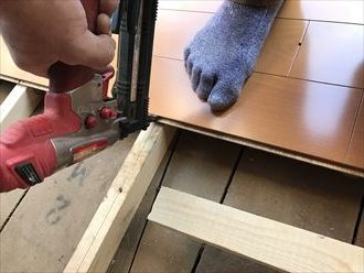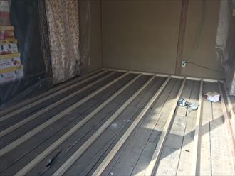新規に根太を重ねてフローリング床を設置できるようにします。根太とはフローリングを設置するための設ける木枠のことです。これまでの根太の対角になるように新たな根太を作ります。対角に組み上げることによって重さを分散し、これまでの根太の負荷を減らすのです。バリアフリーになるよう、なるべく床の段差ができないように根太の高さを合わせます。