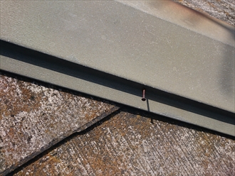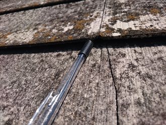 ボールペンが簡単に刺さる程反りが出ています。歩いていると割れそうで怖いくらいです。ここまで反りと割れが酷くなると、塗装をしても殆ど意味が無くなってしまいます。棟板金の釘の抜けもあり今回は塗装工事でのメンテナンスはお勧めできません。屋根全体を確認しましたが、下地の野地板にはまだ傷みが出ていませんので、今回お薦めするメンテナンスは屋根のカバー工事です。ガルバリウム鋼板製などの屋根材を今のスレートの上に葺く事で、今後のメンテナンスの回数を大幅に減らす事が出来ます。傷みが進むと塗装では体操出来無くなりますが、その様な時にはカバー工事がお薦めです。