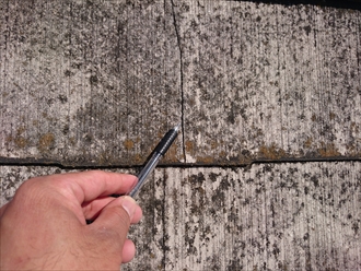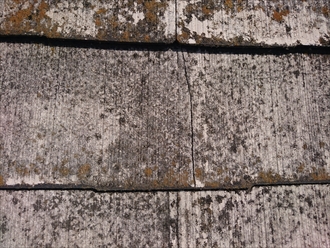表面の劣化と合わせて気になる部分はスレートの割れです。タテに割れている部分が屋根全体のあちこちに出ています。タテに割れている場合、新築の時に出来ていた釘穴回りからのヒビが原因の事が多いのですが、こちらの割れは反ってしまったことが原因で起こっている様です。