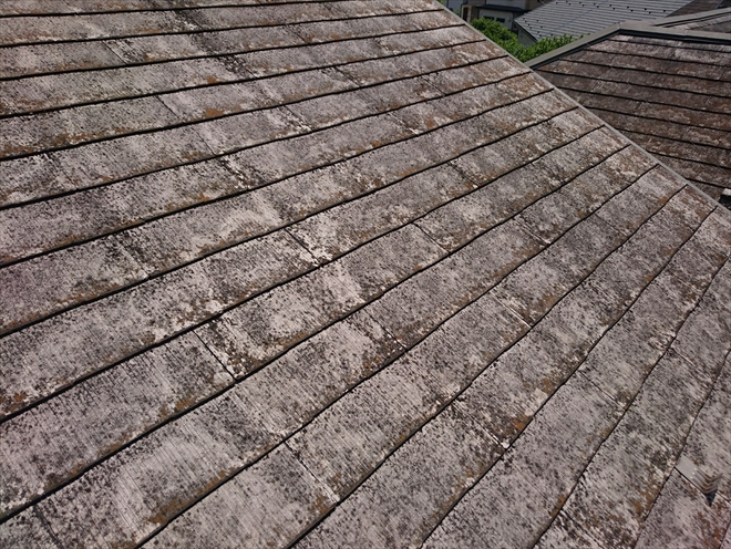 スレート葺きの屋根は表面の劣化が著しく、元々の塗膜が剥がれてしまって白い基盤が剥き出しになっていました。撥水性が無くなっていて、コケが付着したり剥がれ落ちた塗膜によって表面はズルズルになっていて、気を付けていないと足元を取られそうです。