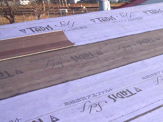 昨日までに既存の屋根材である瓦を撤去し清掃。この際、下地(野地板等)の状態を確認、状態が良かったため、その上に新しい防水紙を設置し、金属屋根の葺き替えをスムーズに行える状態にしてスタンバイしておりました。