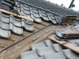屋根リフォームについては、瓦屋根から金属屋根への葺き替え工事。屋根材の瓦についてはさほど傷んでいる状況ではありませんでしたが、築年数や耐震性について考慮し、屋根の軽量化のため重量の軽い金属屋根へ葺き替え工事を行います。