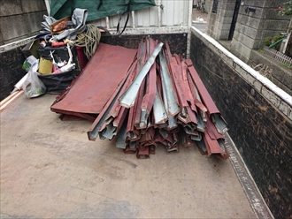 川崎市宮前区で屋根の葺き替え工事をおこなっています。トタン葺きの屋根は何度か修理を繰り返してきた様ですが、雨漏りも始まり傷みの度合いが限界なので新しい屋根材に葺き替えます。勾配が緩い屋根の場合は、よくあるスレートなどの横葺きと呼ばれる屋根材は雨漏りの原因になる事もあるので使えません。必然的に軒先から棟までが一枚の屋根材で作られた屋根材しか使用できません。昔からある瓦棒葺き(かわらぼうふき)という屋根などがこれに該当します。全体的にサビが広がっていて穴も開いています。また用途が良くわからない箱が屋根に穴を空けて取り付けてあるので、この回りも雨漏りに繋がる部分です。雨樋も詰まっていて傾いているので交換を一緒におこなった方が良いでしょう。昔からあるトタンと呼ぶ板金ではなく、新しい屋根材はサビにくくて耐久性が高い、ガルバリウム鋼板を使用して今後のメンテナンスが少なくて済む様にしていきます。