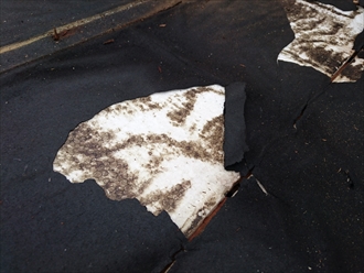 葺き替え工事が始まり、古いトタン屋根を剥がしていきます。黒いものが古い防水紙(ルーフィング)で、熱によってトタンに張り付いていて、屋根材を剥がすと一緒にベリベリと剥がれてしまいます。