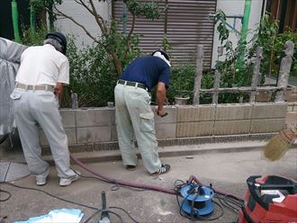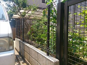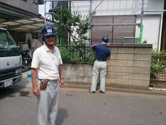 工事前に写真撮影です。三人で作業を行います。作業の内容は門扉の交換、擁壁の切断、新規フェンスの取り付け工事です。まずは擁壁の切断を行いながら既存のフェンスを撤去いたしました。騒音と埃が出てしまいますが、騒音はなかなか減らせないものです。その分、手際よく作業をすすめるのが最善策かもしれません。埃に関しては強力なバキュームで吸い取りながら作業を行いますがそれでも若干舞い上がってしまいます。擁壁の切断と既存フェンスの撤去がおわったら、新規のフェンスと門扉を設置しモルタルで固定いたします。フェンスは設置できますが、門扉はモルタルの養生の為にも門扉の支柱を埋め込んだ後、約一日時間を開けさていただきました。