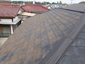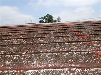 こちらの写真はほかのお客様の横葺きでのカバー工法を行う予定の屋根です。表面上はやはりスレートのコロニアルタイプの屋根材で葺かれています。小屋裏の中を確認すると今回の縦葺きカバー工法を行っているお客様の屋根構造とは真逆で棟から軒先に向けて「垂木」が垂直に伸びています。これがどちらかと言えば一般的な構造とも言えます。通常のスパンは垂木間が455mmとなっています。これであれば横葺きの新規屋根材をしっかりと垂木に固定することが出来ます。屋根の丈夫な部分に固定されている方が安心ですよね?このような違いで縦葺きのカバー工法を選択したわけです。