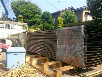 屋根の表面上はスレートのコロニアルタイプの屋根材ですから、当然横葺きで葺かれています。小屋裏の中を見ますと通常屋根の頂点部分の棟側から軒先に向かって垂直に組まれている「垂木」がありません。右の写真の屋根側に見えている角材は「母屋木」と言われる部分です。それも鉄骨のトラスに対して母屋木が垂直に、それもピッチが910mmと広いスパンで組まれています。屋根カバー工事ですから野地板にビスを効かせればよいのですが、雨漏りもしている野地板に、もちろんすべてではありませんが、ビス止めだけで新規の屋根材を葺いていくのは、いささか危険が伴います。