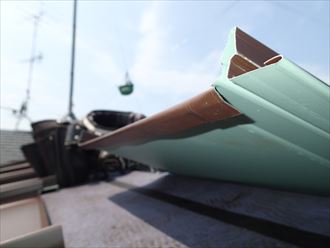 その前にも新規屋根材のスタンビーの軒先側と棟側に加工を施さなければ固定することが出来ません。専用の工具を使用して一番最初に設置をいたしました軒先唐草に引っかかる爪を作成いたします。この爪を唐草に掛けて棟側から引っ張り上げるという作業が猛暑の中では地獄でした。