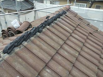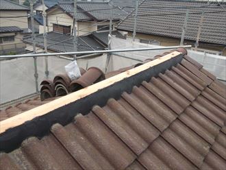 棟の取りなおしは冠瓦を外し、既存の貫板、土、漆喰を撤去清掃の後、逆の手順で組み直して行きます。新たに使用した漆喰は南蛮漆喰です。