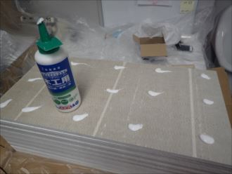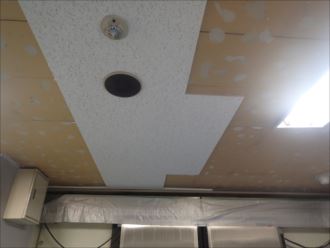 使用した天井資材は、吉野石膏の化粧ボードで不燃材のソーラトンST12-S-600になり、フィッシャー柄になります。平板材は捨て貼り工法になり、下地などで一度捨て貼りをし表面にソーラトンを貼り付けます。