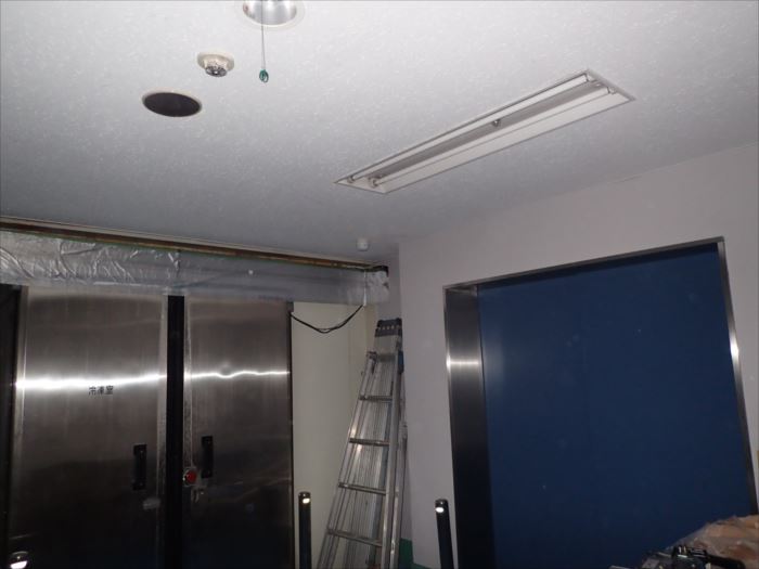 工場ホールの天井張替えですが、大きな冷蔵庫倉庫前の天井に冷蔵庫の不具合にて漏水が生じてしまったそうです。数日後には黒カビが発生し、商品を扱う倉庫なので根源からの解決を目指し、天井貼り替えの工事になりました。工場ともあり防火上、不燃材を使用しなくてはいけません。今回の工事では、不燃材を備えた吸音材を使用し設置してまいります。