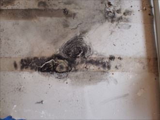 今回、漏水箇所を確認した場所は天井上にあるパラペット部分の笠木部分でした。建物に新規に付けた資材との取り合いが上手くできていない事と、笠木の経年劣化によるものと判明しました。長い間、浸水していた模様で、石膏ボードには黒カビが生えていました。