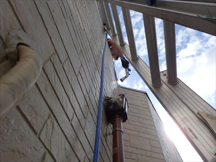 まず散水調査にて、雨漏れ個所の場所を特定いたします。雨漏れは何処から入っているかを確実に特定しないと、どのような工事したら一番確実に治せるかも判断することができません。実際にホースにて低い位置から順に水を流して行き、漏水箇所を特定できるまで行います。