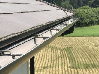 今回のご訪問では、「雨が降ると雨樋の部分から雨漏れしているようだ」とお伺いしていたので、雨樋のチェックも致しました。雨樋などの付帯部にはファインSiを塗装しています。雨樋は経年で古くなっていますが、塗装をしていれば、表面保護となり、樹脂製品であっても早々に破損することはありません。汚れなど詰まった形跡もないので、雨漏れの原因は無さそうでした。雨樋の部分から雨漏れの原因としては、アンテナを支持しているワイヤーのフックに屋根からの雨水が伝わって屋根下へと落ちていることが考えられます。雨樋自体には問題は無く、補修をせずに済んで何よりです。アンテナにはどうしても支持ワイヤーがあり、倒れないようにしています。改善にはアンテナの移動やワイヤーやフックなどの支持部品の交換がありますが、結構な出費となります。