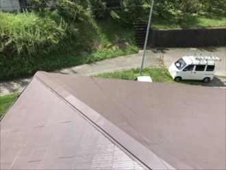 君津市のお客様邸は敷地の大きな立派なお家です。ちょうど一年前に屋根塗装・外壁塗装を施工しており、保証期間の定期点検を行います。屋根の状態は非常に良く水はけが良くなっています。棟板金などに塗料の剥がれも見当たらず、非常に良い状態です。