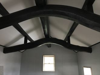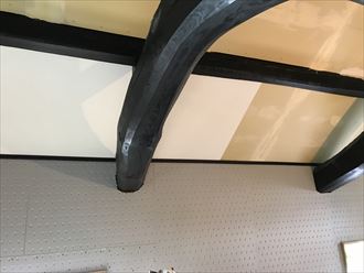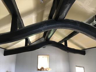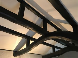 天井にクロスを貼りました、曲り梁が黒い色なので、白いクロスを貼るとひと際見栄えが致します。照明にはレール照明としてペンライトを設置予定ですので、光と影のコントラストが期待できます。現在でもこのような曲がった梁が揃っているのも珍しく、天井を白いクロスにしたことにより梁が強調でき、美しい仕上がりになりました。