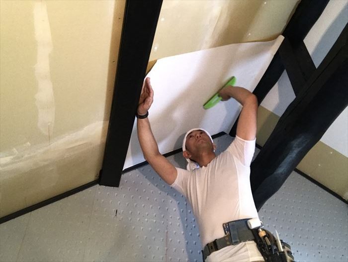 クロスを貼る上で一番初めの工程は貼る面を平らにすることです。クロス屋さんの工事はパテを塗りこみ、クロスを貼る面を平らにすることからはじめます。粘土状のパテを凹凸部分に塗りこみ、平らにしていきます。パテには下地パテと仕上げパテがあり、乾いたら削り、指で触っても凹凸が分からないところまで平らにします。平らになるまでは工程の繰り返しです。この工程が終了してからようやくクロスを貼ることができます。