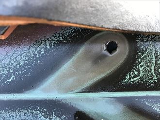 谷板金に点々と穴が開いていました。「谷板金とは、屋根の形状に折り返しの部分がVの字になっている部分」になります屋根に当たった雨水の一番集合してしまう部分になります。何故、点々と開いているかというと、原因は雨のしずくです。屋根に残ったしずくは一点に集中してしまうため、小さい穴が開いてしまいます。大きな流れですと全体に力が逃げるため、穴は開きずらいのですが、同じ場所に一点集中してしまうと、穴が開き始めてしまいます。一滴の力はあなどれません。