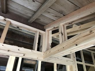 地震に耐える補強には耐震と免震があります。今回は耐震補強をしていきます。いろいろある中で言葉通りの耐震補強というのは壁などの構造体を強化して地震の揺れに耐えるようにすることです。昔の蔵は分厚い土壁も耐震補強をを担っていました。柱は全て通し柱で屋根まで伸びています。柱と柱の間に大きな貫板を横に貫き連結させてありました。100年も経つと歪みや劣化により強度が低下してきます。傷みが激しい箇所は柱の入れ替えなどの補強も大切です。
