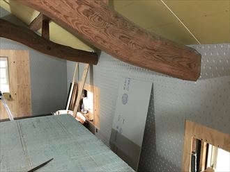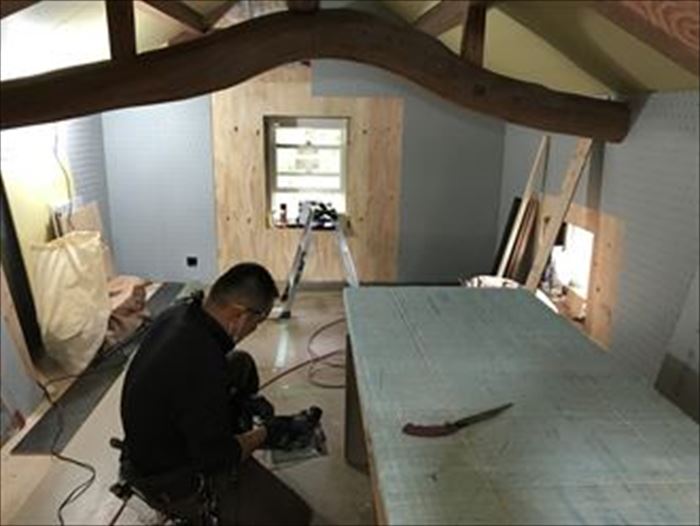 君津市にお住まいのお客様の築100年経つ蔵のリフォームしています。内部もだんだん、お部屋らしくなってきました。お客様が自ら珪藻土を壁に塗りたいとのご要望で、下地となるラスボードを張りました。