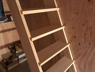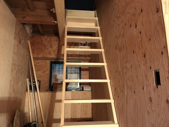 今回は蔵ですので開口スペースが小さくゆるらかな勾配が取れないため、少々急勾配になってしまいます。梯子としてお使いが可能なように脱着が可能にしてあります。踏面も出来るだけ大く確保するようにスリット階段にしています。段差も23センチ以下にして少しでも安全な階段にしました。スリット階段ですと狭い空間でも圧迫感が軽減されて広く感じられます。狭い空間ならではこそ一工夫と安全を確保するのが大変でした。