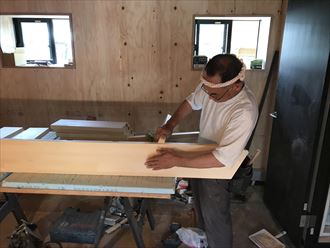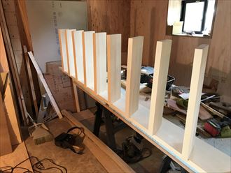 階段の工夫として今回はスリット階段にしました、スリット階段は蹴込板がないタイプで踏み板のみとなります、踏み板だけですと、荷重が踏み板でしか支えられないので、より丈夫な板が必要になります。集成タモ材を併用して今回の工事では設置して行きます。二階の高さから段数を割り出します、割れ付けをするにあたり、最低の水準が建築法で定められています。一段の高さが最高23センチ以下にしなければなりません。実際にこの数字よりも大きい段差になると上る時は気にならない方も居るとは思うのですが、一番気お付けなくてはいけないのが降りる時です、勾配がきつく急な時にこそ踏み外すことが多く危険です。