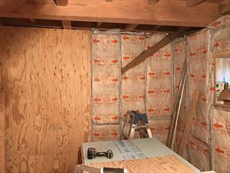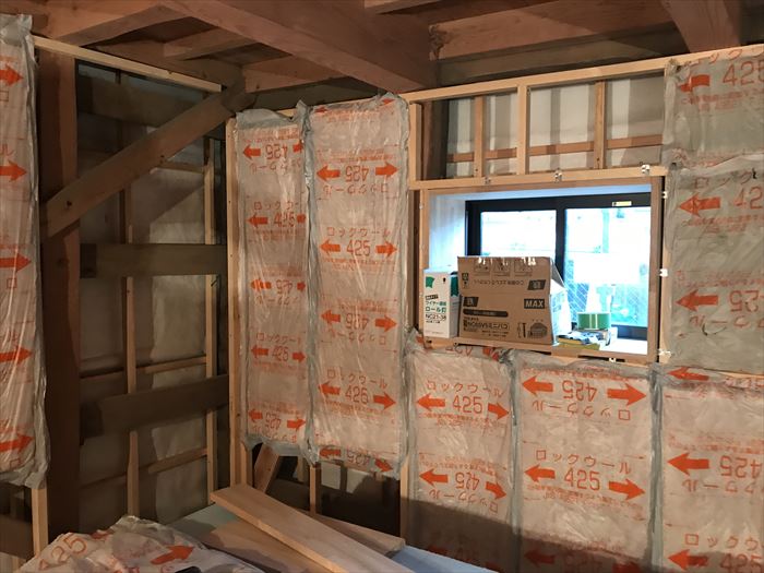 築100年の蔵、今日は壁の断熱工事で、壁一面に断熱材を敷き詰めました。断熱材の種類にもいろいろありますが、今回はロックウール断熱材を使用いたします。