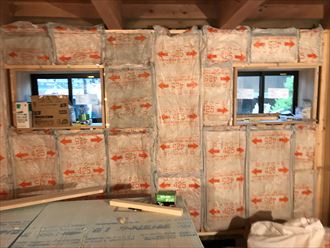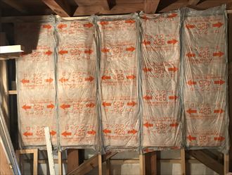 下地を組み、その間に断熱材を敷き詰めました。マットというか小さめのクッションみたいになっており、それがビニールで密封されています。幅が425ミリあり、通常の柱芯が455ミリの下地の間に収まるように作られています。主に壁や天井の断熱材として一般住宅用に使用します。