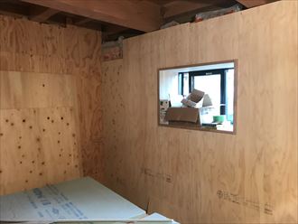 内部の補強としては柱の間に筋違い柱を角隅に設置いたしました。筋違いは縦方向と横方向に設置しなければ強度を保てません。必ず建物の縦方向と横方向の設置が必要です。設置には金物として専用の筋違いボックスを使用いたしました。一つで3点の結合が可能になります。柱・土台・筋違いということです。部屋の中は全て構造ベニヤで補強します。一枚一枚が筋違いの役割を果たし、ツーバイフォー工法と同じような構造になります。外も中も耐震補強をしてこの先大きな地震が来ても安心です。
