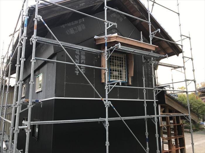 建物そのものは蔵の作りです。全ての柱が通し柱で作られており、横板をそれぞれ等間隔に通してあります。当時の壁が土壁ですので若干の歪みなどは壁の塗りしろで調節されるために、そこまで正確には建っておりません。現代では垂直水平に建物が建っていなければ資材などの収まりがつかなくなるので、外周と内周に新たな壁下地を設置いたしました。外周の耐震対策としては壁にラスカットベニヤを採用いたしました。ラスカットベニヤは表面に防水性のモルタル材を設置してあり、漆喰などをそのまま塗れるようになっていります。耐震性に優れているため、外部の補強としてよく使われます。