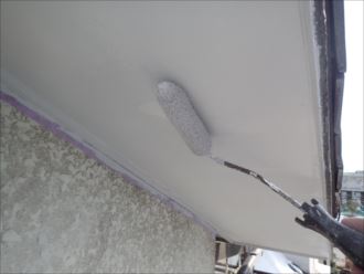 ケイカル板を貼り付けた後は、塗装により仕上げます。今回は日本ペイント、カチオン形弱溶剤アクリル樹脂系非水分散形塗料ケンエースGⅡという塗料を使用します。外部や軒天などに適しており、ヤニ止めや浸み止めに効果を発揮いたします。湿気などにも強く、低汚染ですので室内や浴室などにもよく使われる塗料となります。