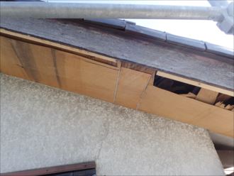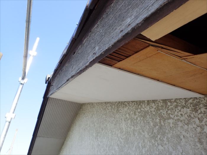 軒天は化粧ベニヤで破風は木質です。状況から見ると、ケラバや破風の劣化により反りが発生し、雨水が入り込み化粧破風が剥がれ出したと思われます。