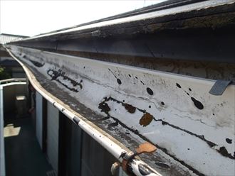 調査にお伺いしてみるとベランダの雨樋が変形していました。変形している所を見てみますと、雨水が溜まっていた形跡がみられます。一度、変形してしまった雨樋はほぼ直りません交換が必要となります。お客様にお話を聞いたところ、数年前に雪が降ってから変形してしまい、雨が降ってくると溢れ出て来てしまうとのことです。