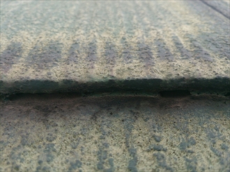前回の塗装の際に、スレートの重なり部分が塗料で塞がれていた様で、この様になっていると雨水の逃げ道が無くなって雨漏りに繋がります。スレートの重なりは必ず縁を切っておかないとなりません。