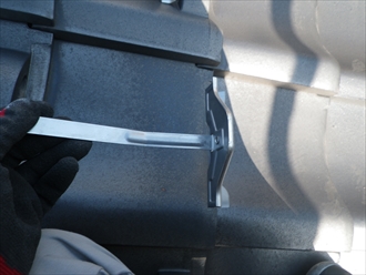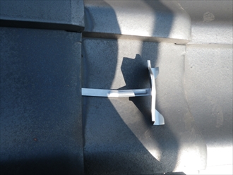 持ち上げた瓦の隙間から後付け様の雪止めを差し込み、曲がった部分を下の瓦に引っ掛けます。